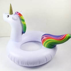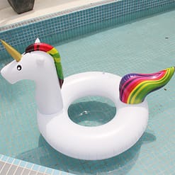 Les petits comme les grands apprécieront passer l’été avec cette adorable bouée licorne blanche décorée d’une crête et d’une queue aux couleurs de l’arc en ciel.
